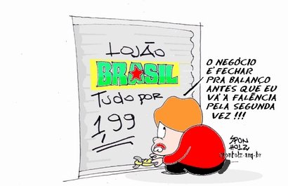 O chargista lembra a falência das lojas e a associa ao que, para ele, é a falência da gestão presidencial. Também fui comerciante mal-sucedido, e a bem da verdade continuei sendo um fracasso em todas as atividades que abracei, se considerado apenas o lado material. Mas minha incapacidade e falta de talento para gerir negócios, para ganhar dinheiro, só é prejudicial a mim mesmo e a meu filho caçula, único dependente que ainda não caminha com as próprias pernas, coisa que em breve o fará. Nunca pensei, por isso e mais alguma coisa, em assumir cargos de representatividade pública porque um político, desde um reles vereador a um presidente tem de possuir capacidade de gerir negócios públicos (mais complexos que os de uma lojinha), de auferir lucros, de viabilizar ganhos para a coletividade. Que tipo de gestor eu seria? Um malogrado!