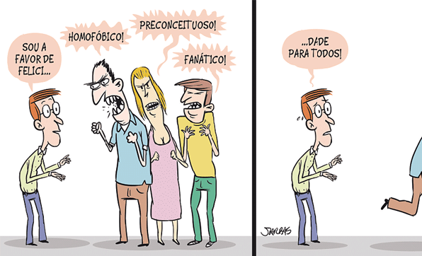 Para mim, cada qual faz de seus furinhos, falinhos e falões o que bem entender. Não tenho nada com isso se duas mulheres resolvem unir as borboletas, ou se dois homens embainham mutuamente suas espadas. E, claro, repudio toda e qualquer forma de intolerância, seja religiosa, de raça, de orientação sexual, de marca do xampu. Isso quer dizer que repudio também os intolerantes como os do desenho. Foi só o rapaz começar a dizer que é a favor da felicidade para, à menção das duas primeiras sílabas as pessoas se precipitarem nas catilinárias verbais julgando que ia se referir ao deputado Feliciano.