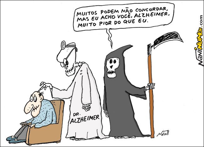 Esta charge do Nani, embora o próprio artista faça uma ressalva de que muitos podem não concordar (queremos nossos entes queridos distantes da dama da foice), aborda o terrível Mal de Alzheimer. Trata-se de um distúrbio neuro-degenerativo que provoca progressivamente o declínio das funções intelectuais, reduzindo as capacidades de trabalho e relação social. Mas é também uma doença cujos sintomas, sua gravidade e velocidade variam de pessoa para pessoa.
