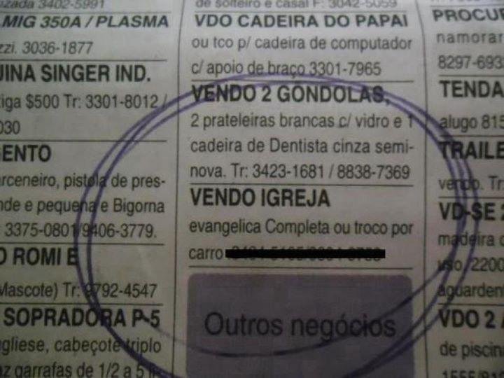 Quantos templos religiosos a gente vê por aí. Um cidadão aluga uma salinha, coloca lá um tablado e algumas cadeiras e pronto: mais um representante de Jesus na Terra devidamente creditado a defender o Seu santo nome e difundir Sua palavra. Tomando por base as Bom Jesus, imaginem a proliferação dessas casas de orações por todo o Brasil e esse mundão de pecados!