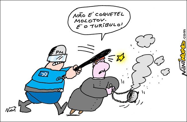 O cartunista Nani evoca a baderna que persiste na cidade do Rio de Janeiro por bandidos infiltrados nas merecidas manifestações contra o governador Sérgio Cabral. A polícia não sabe se age com o rigor que é necessário, caindo nas bocas de matilde de certos setores da imprensa e dos defensores dos coitadinhos depredadores e ladrões, ou não agir de nenhuma maneira (e aí também cair nas mesmas bocas de matilde que a acusam de inércia e pusilanimidade). Na charge, a PM está em ação, mas não precisava exagerar ao descer o cacete num religioso que está balançando o seu turíbulo, confundindo o objeto que libera fumaça com um coquetel molotov.